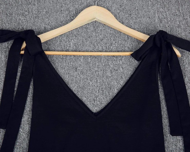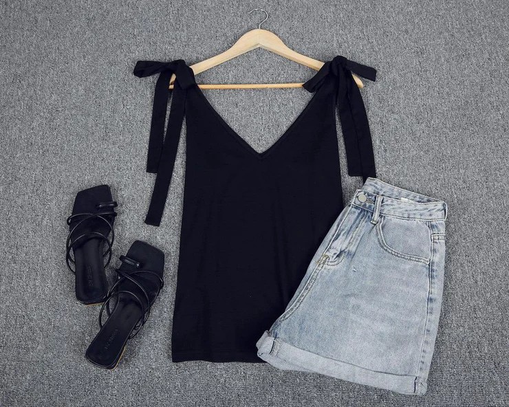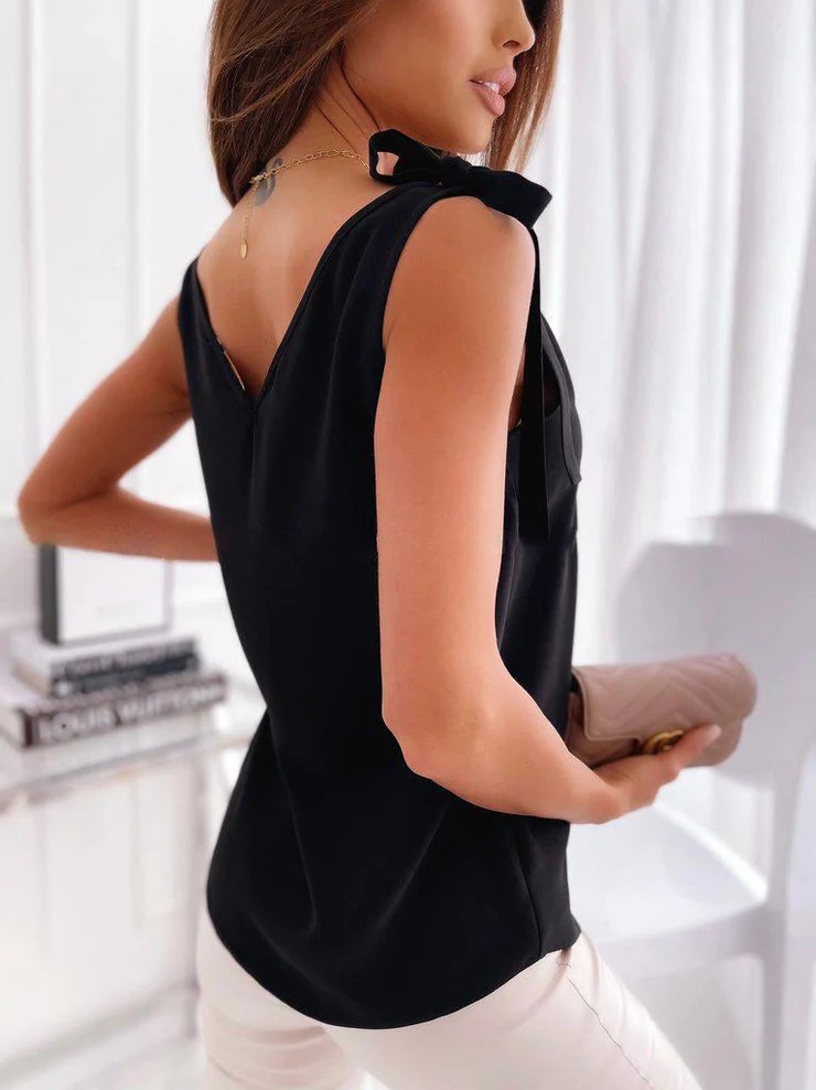It's your time to shine! What better way to enhance your look than a signature top you can't find in stores? This sleeveless top features sting ties on your shoulders and a V-neck neckline. The shift silhouette looks great with a pair of skinny jeans or even a classy skirt. Neckline: V-neck; Sleeve Length: Sleeveless; Pattern Type: Plain; Silhouette: Shift; 65% Cotton, 35% Elastane; Machine Washable; Relaxed Fit.