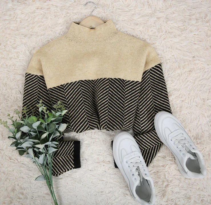 This cozy color block baggy sweater features an all-over black and white pattern complemented by an apricot top creating a beautiful blend of solid color and pattern. An oversized fit, long sleeves, and high neck keep you looking sophisticated and warm. Finish your look with layering jewelry, jeans, leggings, and boots. Machine wash normal with light colors or hand wash. Bleach if needed. May be hung up to dry or lay flat. Tumble dry with low heat. Light ironing if needed. Neckline: High Neck; Sleeve Length: Long Sleeve; Pattern Type: Color Block; Cotton/Acrylic; Machine Washable; Relaxed Fit.