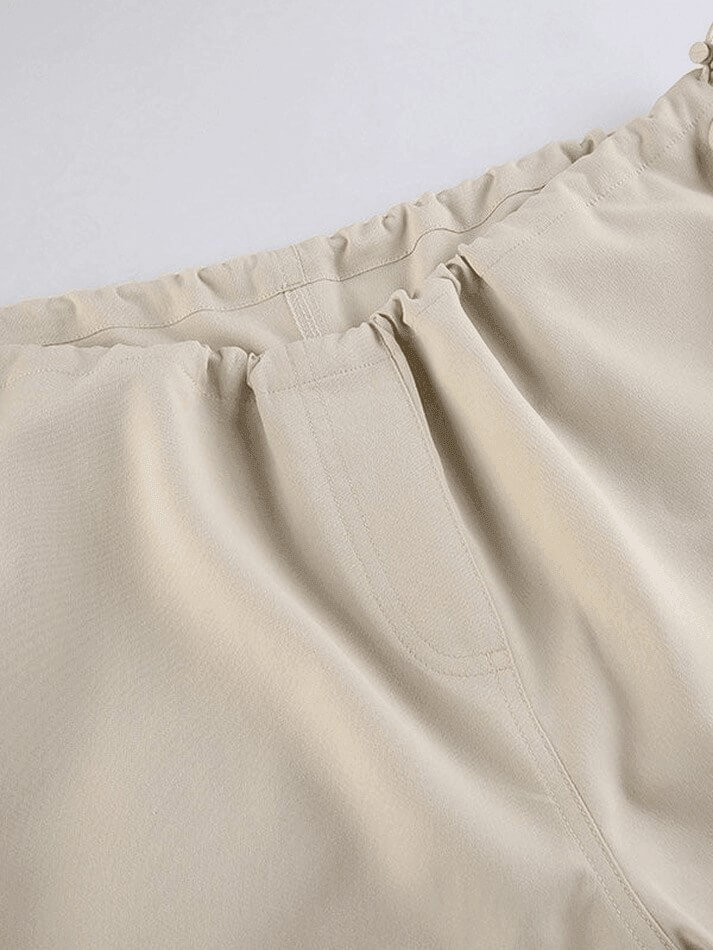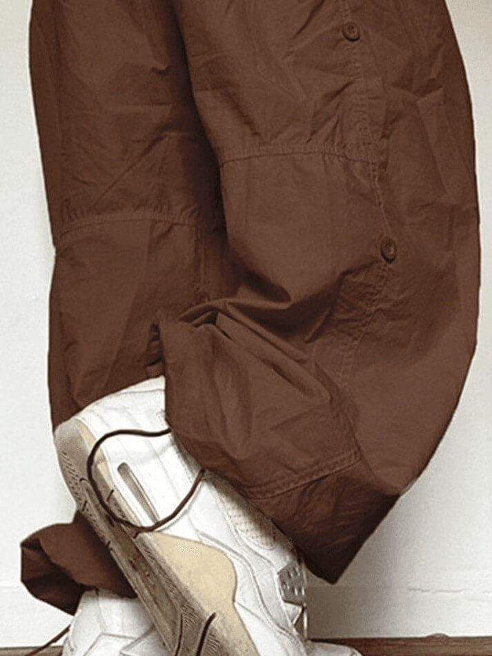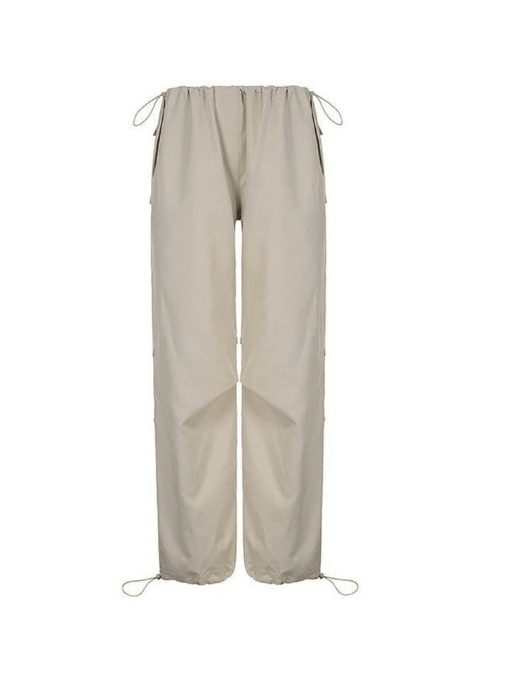 Style: Casual/Street/Y2K/Vintage/Hip Pop/Punk/Grunge; Fabric Content: Polyester, Spandex; Fit Type: Relax fit; Description: These on-trend cargo pants sit to an elasticated waist with drawstring detail, shaped to a relaxed silhouette, and ended with a drawstring cuffs design for an extra flexible fit.