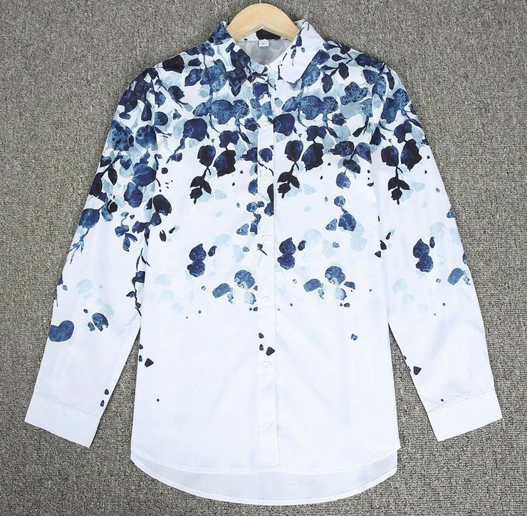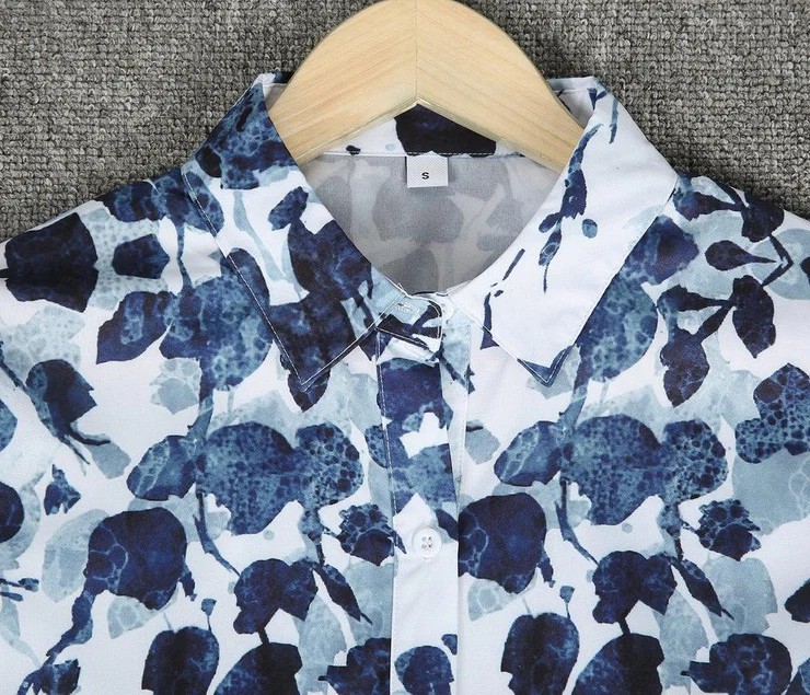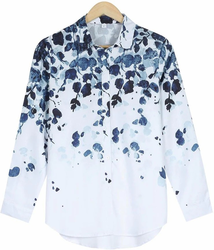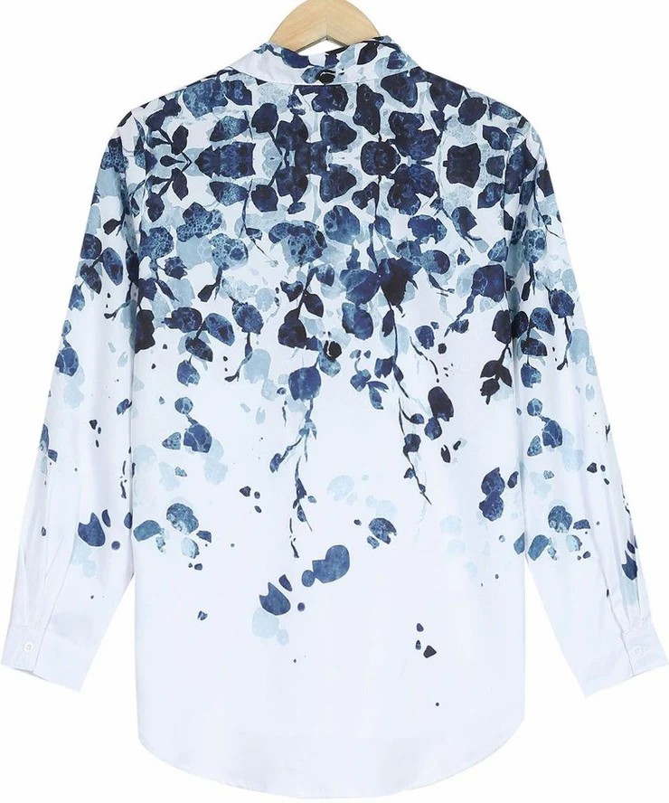 A white button-up blouse is a wardrobe superhero. But it’s the beautiful blue petal print that takes this polished top to the next level. Styled with a crisp collar and extended shirttail hem, this creative top is a quality classic—but so much better. Pair it with slim-leg pants and a quilted purse. eckline: Collared; eeve Length: Long Sleeve; Pattern Type: Print; Silhouette: Shift; Front Button Details; 40% Elastane, 60% Rayon; Machine Washable; Relaxed Fit.