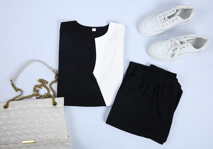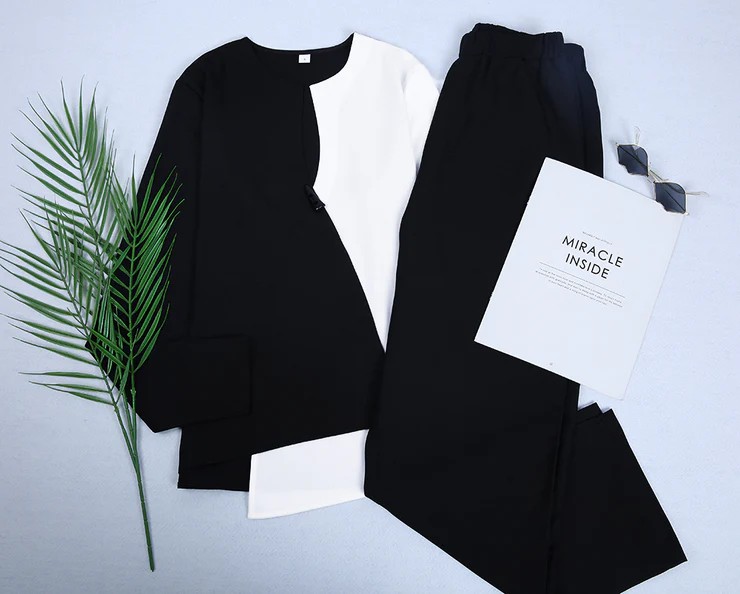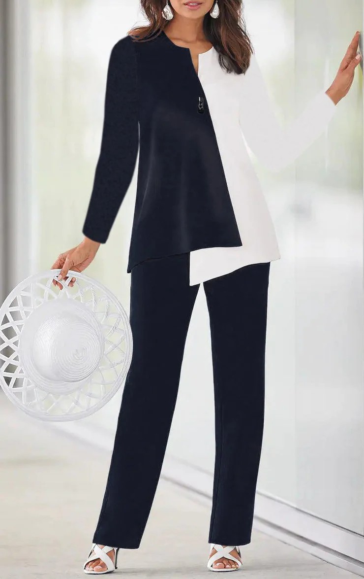 This 2-piece business casual pant and blouse matching set is all you need for a streamlined, professional look that can also be worn to dinner, conventions, and presentations. The black and white color block long-sleeved blouse and elastic waisted pants make this pulled-together set your favorite for any time you need a refined impression. Machine wash normal with light colors or hand wash. May be hung up to dry or lay flat. Light ironing if needed. Neckline: V-neck; Sleeve Length: Long Sleeve; Pattern Type: Plain; 55% Cotton, 45% Elastane; Machine Washable.