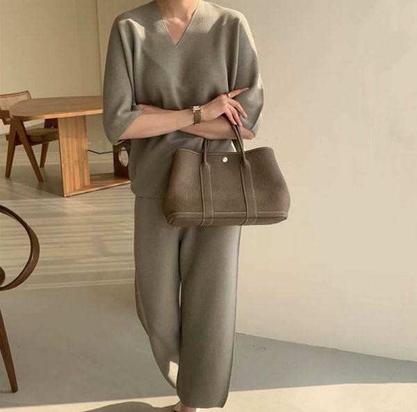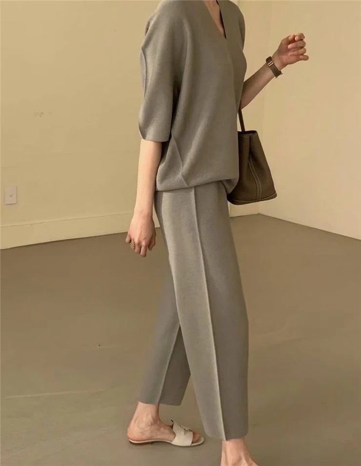 This sleek matching top and pants set is the ultimate selection for any time, suitable for work, travel, leisure, shopping trips, and so much more. The plunging v-neck top can be matched with different jewelry for a dressed-up style. The ankle-length pants give this comfortable set versatility; pair them with heels or work flats. Both pieces fit loosely, elegantly skimming the body. Machine wash cold tumble dry low to medium heat. Iron if needed or lay flat to dry. Neckline: V-neck; Sleeve Length: 3/4 Sleeve; Pattern Type: Plain; Cotton/Acrylic; Machine Washable.
