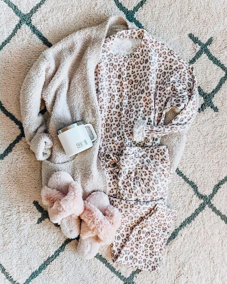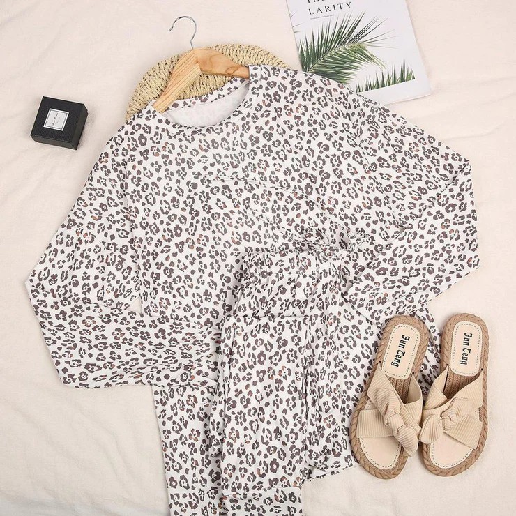 We’re moving up our bedtime as an excuse to slip into these super-cute and totally comfy leopard-print pieces made for couch lounging and catching eyes. The set features an easy-fit sweatshirt and slim-leg drawstring pants in a matching print. Just add fluffy slippers and a glass of chamomile tea for the perfect wind down. Sleeve Length: Long Sleeve; Pattern Type: Leopard; 65% Rayon, 35% Elastane; Neckline: Round Neck; Elasticized Drawstring Waist; Machine Washable.