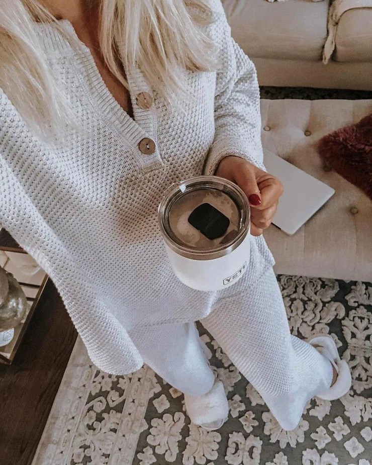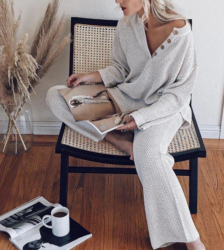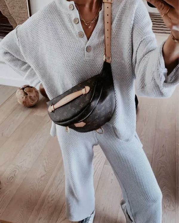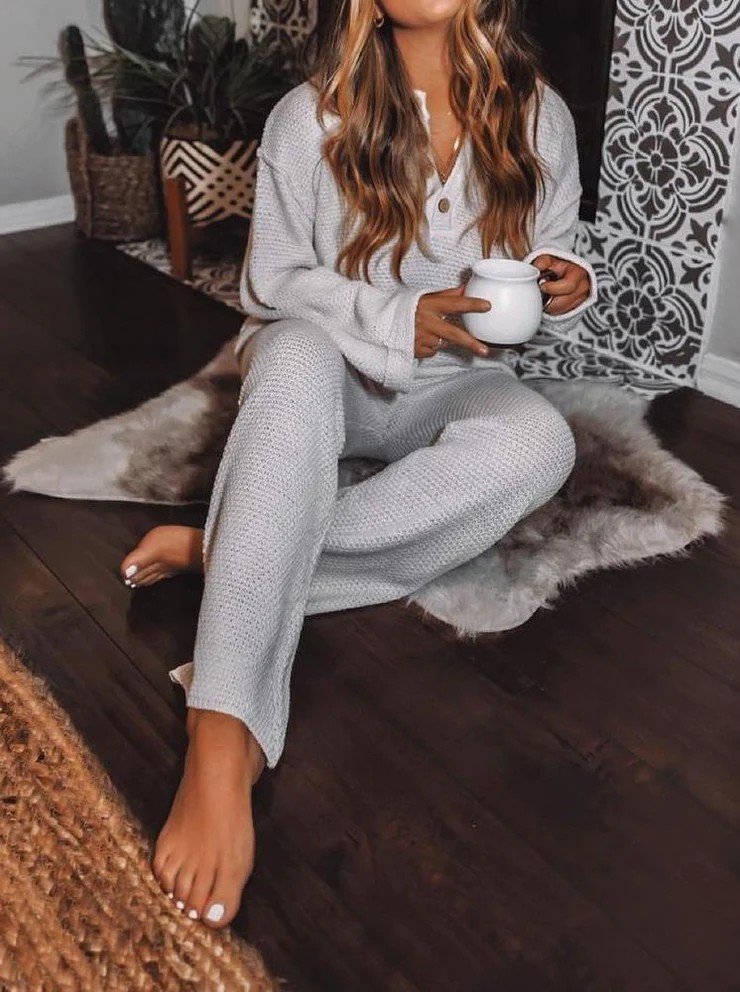 Enjoy every minute of your time at home in this laid-back loungewear set crafted in textured thermal fabric. With four round buttons at the top, you can create a round neckline or undo them all and slip it off your shoulder. Designed with a roomy, relaxed fit, the ensemble features dropped shoulders, cuffed sleeves and gently wide-leg pants. Neckline: V-neck with Button; Sleeve Length: Long Sleeve; Pattern Type: Plain; Wide-leg Silhouette; Relaxed Fit; Wash Cold or Dry Clean.