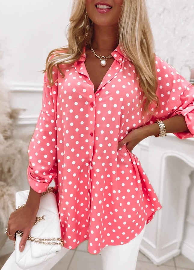 Neckline: Collared; Sleeve Length: 3/4 Sleeve; Pattern Type: Polka Dot; Material: 35% Elastane, 65% Rayon; Machine Washable.